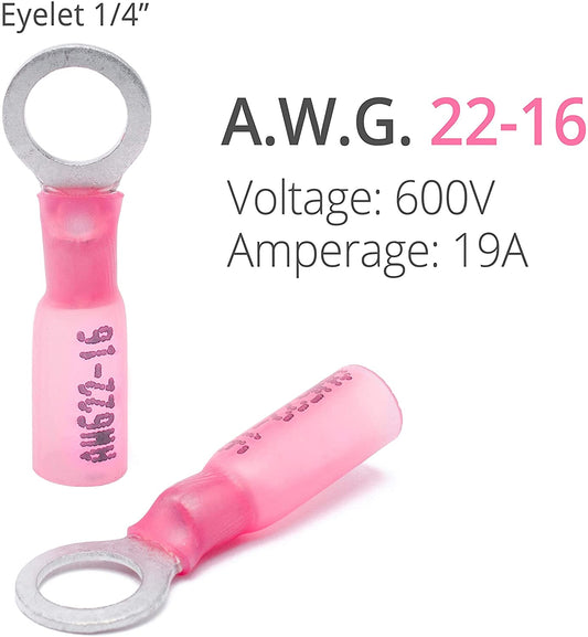 Wirefy 150 PCS Ring Terminals 1/4" Red 22-16 AWG - Heat Shrink Crimp Solderless Wire Connector Kit