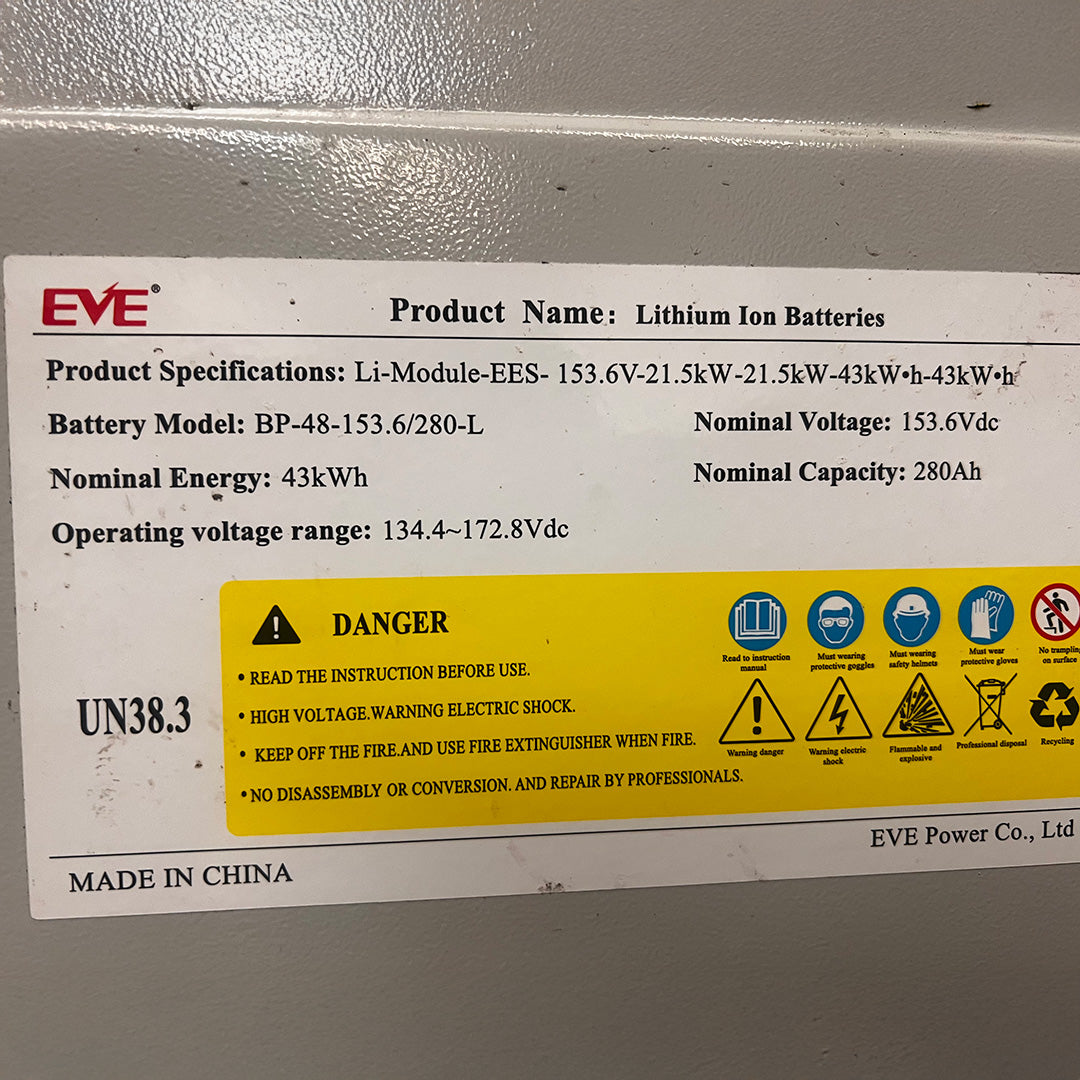 - Configuration: 48s1p (153.6VDC, 280Ah)