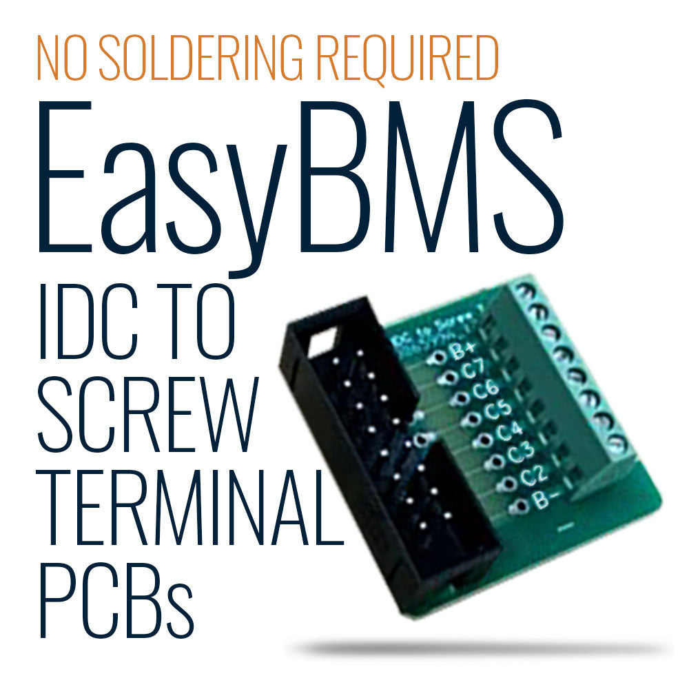 Easily connect a BMS to your battery, no soldering! The EasyBMS Populated PCB provides a simple and complete solution for connecting a BMS to your DIY batteries, no-soldering required. Pre-populated with an IDC connector and Screw Terminal. Simply connect your battery's female ribbon connector with the PCBs male IDC connector, then plug in your BMS wires into the Screw Connectors (learn to use screw connectors here). Precision flathead screwdriver may be required (sold separately here). Make sure you pay close attention to your specific battery configuration and battery chemistry so you choose the right BMS PCB. BMSs sold separately. 16-pin ribbon cable not included, available here. 20-pin ribbon cable not included, available here.