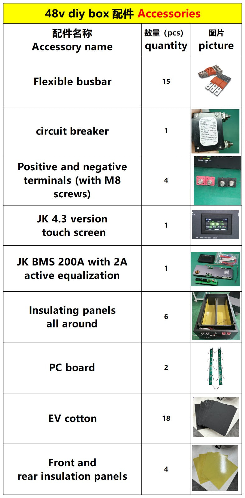 Box requires 16 cells for 52v nominal and it requires the end user to separately purchase and install the cells into the box and connect everything. Assembly is very easy all parts are included, requires very minimal tools, beginner friendly. included a JK 200A BMS with 2A active balancing for long battery life.