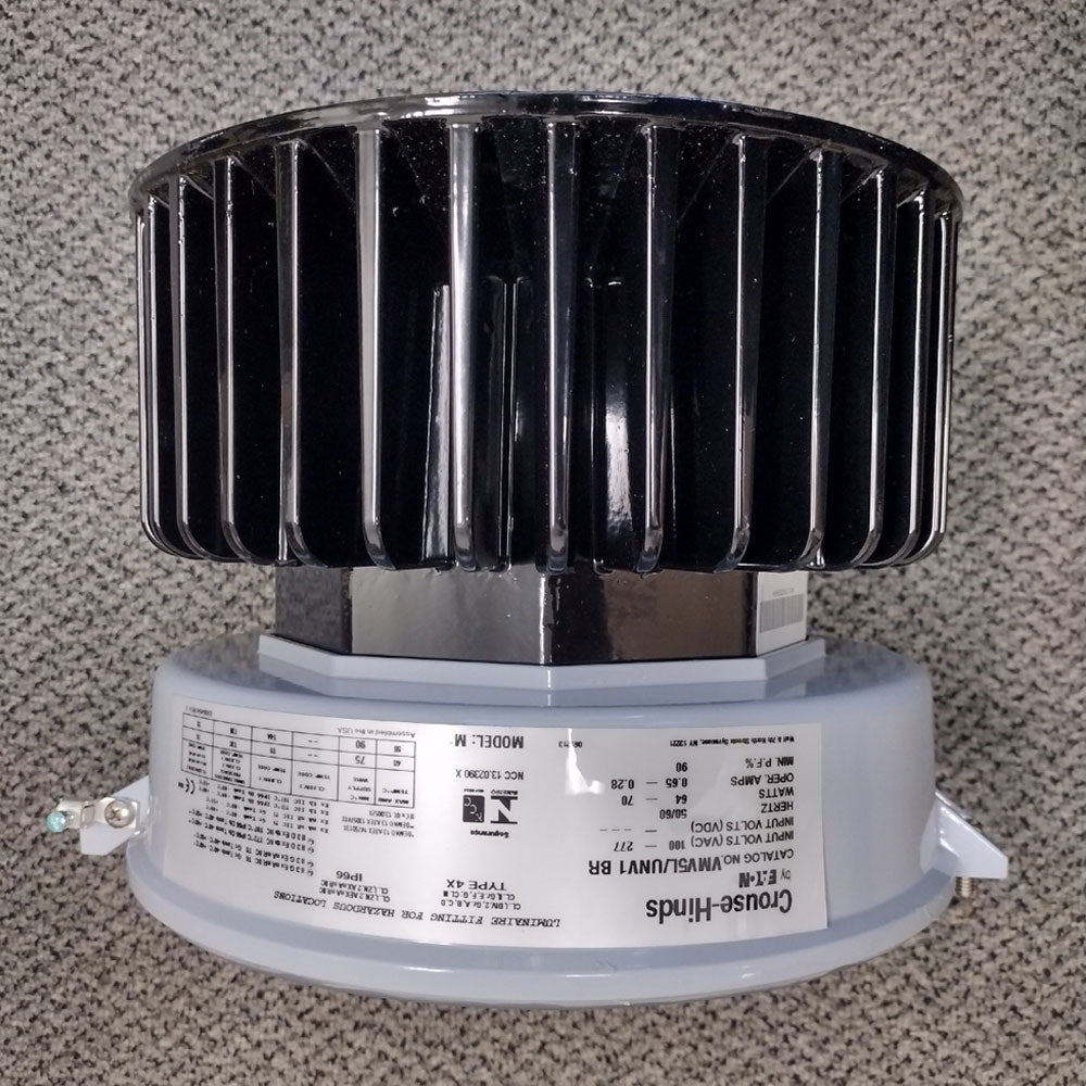 Unused condition, wet location lighting for hazardous locations! High/mid-bay lighting for harsh, hazardous and industrial environments, Eaton's Crouse-Hinds Champ® VMV LED Luminaires can deliver a lighting solution that performs reliably in even the worst operating conditions, all the while reducing your energy, maintenance and manpower costs. IP66 rated for protection against total dust ingress and high pressure liquid jets from any direction. Color temperature is bright white (5335 Lumens). UNV1 model accepts VAC and VDC input. Cat# VMV5L (LED light, less mount module module) and VMV9L (LED light, with stanchion mount module).