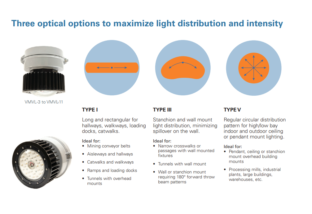 - Oil and gas refineries, drilling rigs, petrochemical facilities, food and beverage facilities, platforms, loading docks, tunnels, indoor/outdoor spotlighting, outdoor wall and stanchion mounted general area lighting, and where flammable vapors, gases, ignitable dusts, fibers or flyings are present