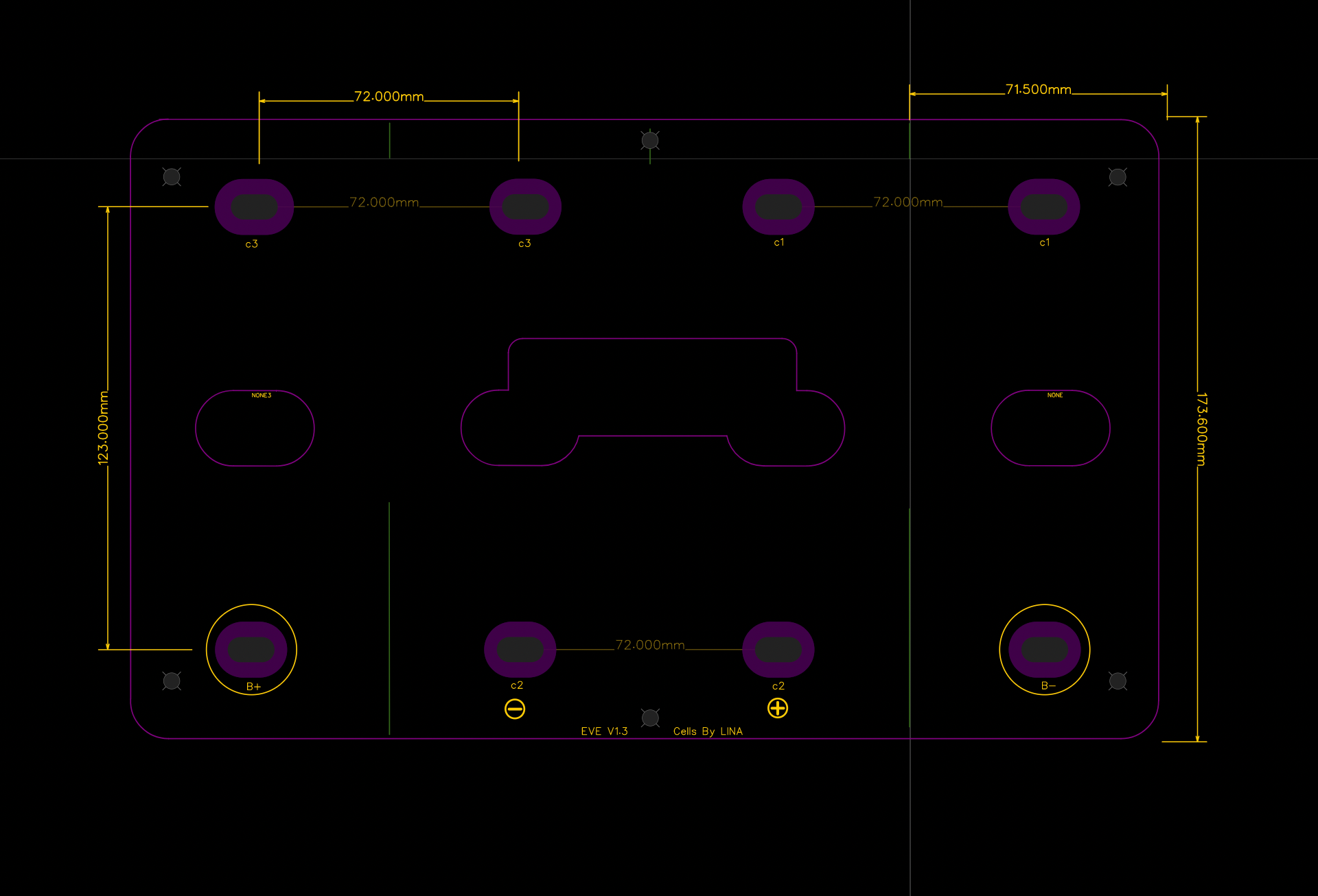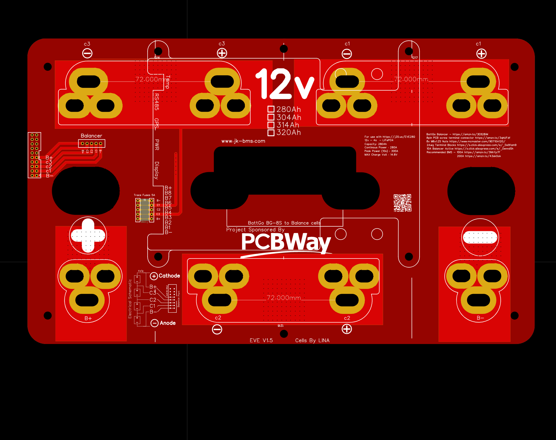 This PCB busbar is designed to easily build a 4 cell 12v battery pack using any LiFePO4 cell that is 204mm x 173mm x 72mm from many manufacturers like EVE, CATL, REPT, Trina, Hithium. Cells in these size come in capacities of 280ah, 304ah, 314ah among others. This busbar helps first time battery builders by eliminating all the guesswork by simply following all the markings on the board, it also terminates all of the balance wire into a single connector for easy BMS installation.