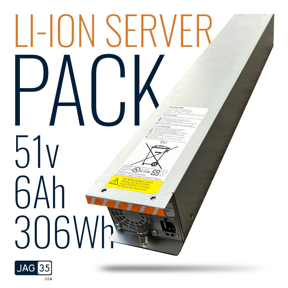 Reclaimed Server Battery li-ion 51v 6Ah 306Wh for DIY use. These contain high quality Panasonic cells. Built in fan + labyrinth flame arrestor. These packs are untested, may have some cosmetic blemishes from storage.